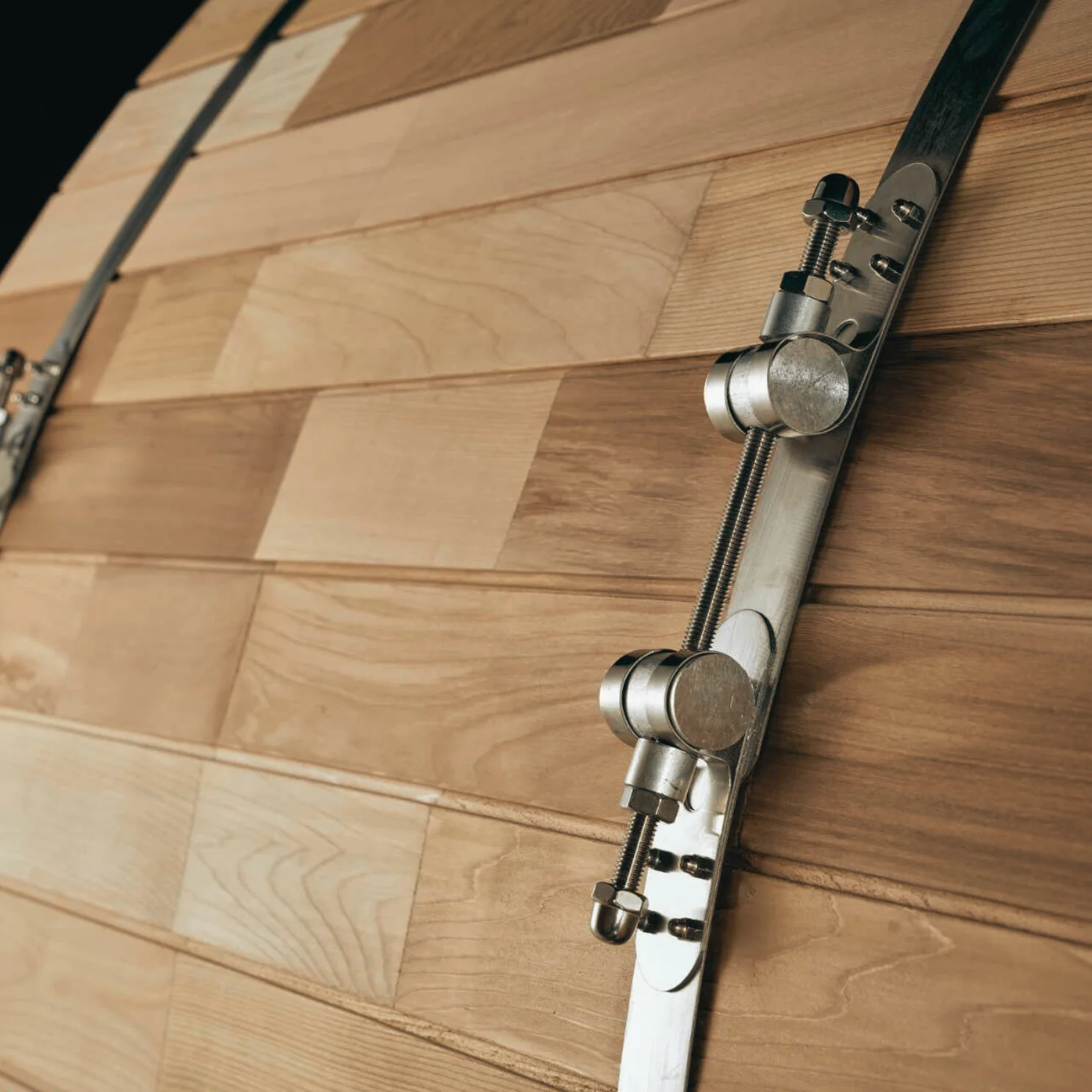 This method requires fewer fasteners while still providing maximized insulation and flexible expansion. The barrel rests on wooden or carbon fibre crates, ensuring stability and ventilation.