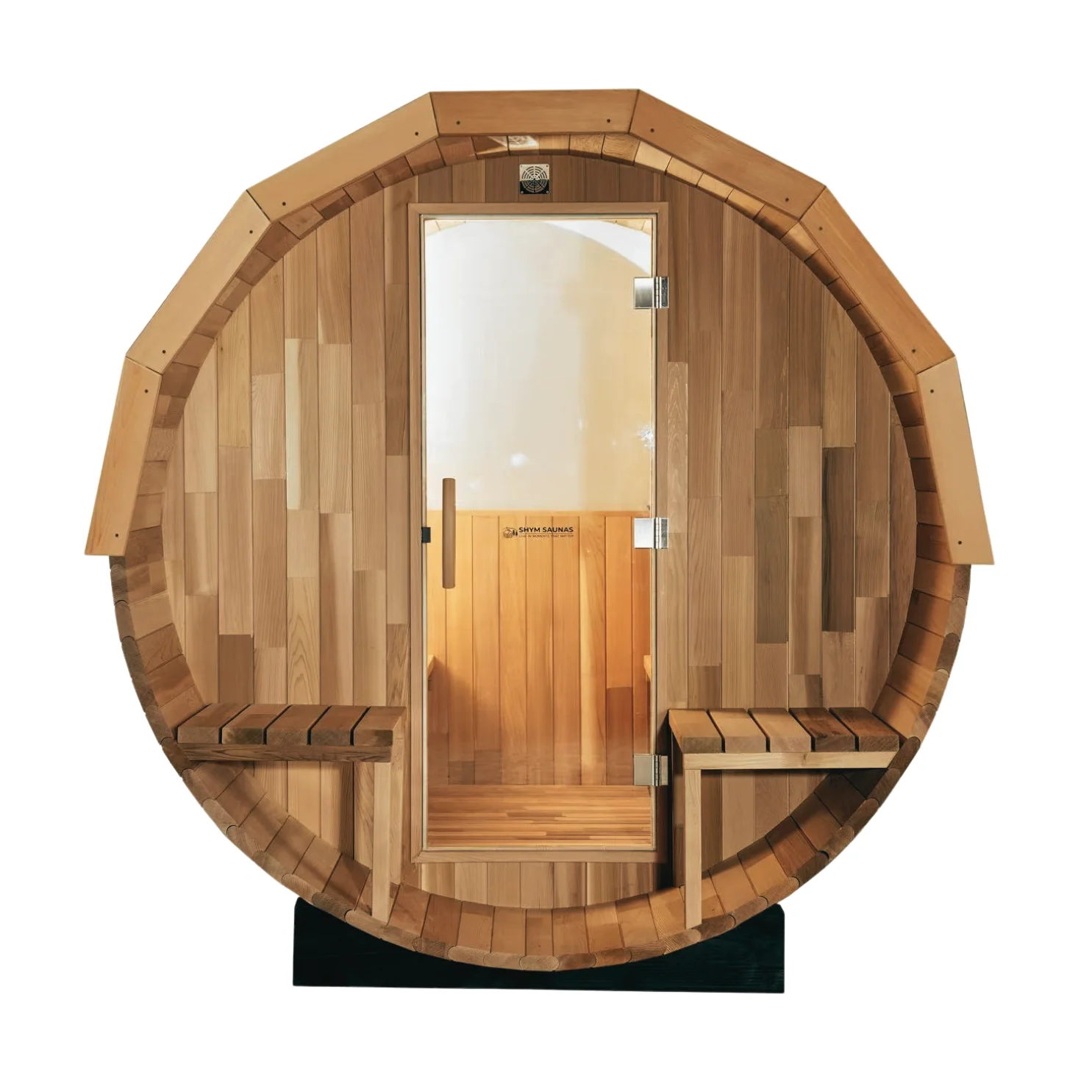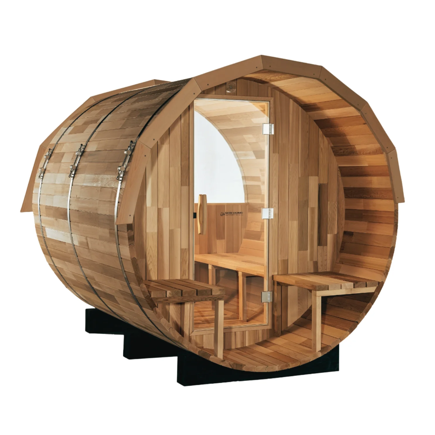 Shym Saunas’ Cedar Barrel Sauna with Porch (4 Person) (NEW 2.0 m DIAMETER DESIGN) is the perfect way to relax and unwind. The interior space allows you to stretch out and enjoy the heat. Plus, there are two exterior benches! This traditional sauna experience takes you to a new height with the sauna’s front porch addition, allowing you to cool down after your sauna session.