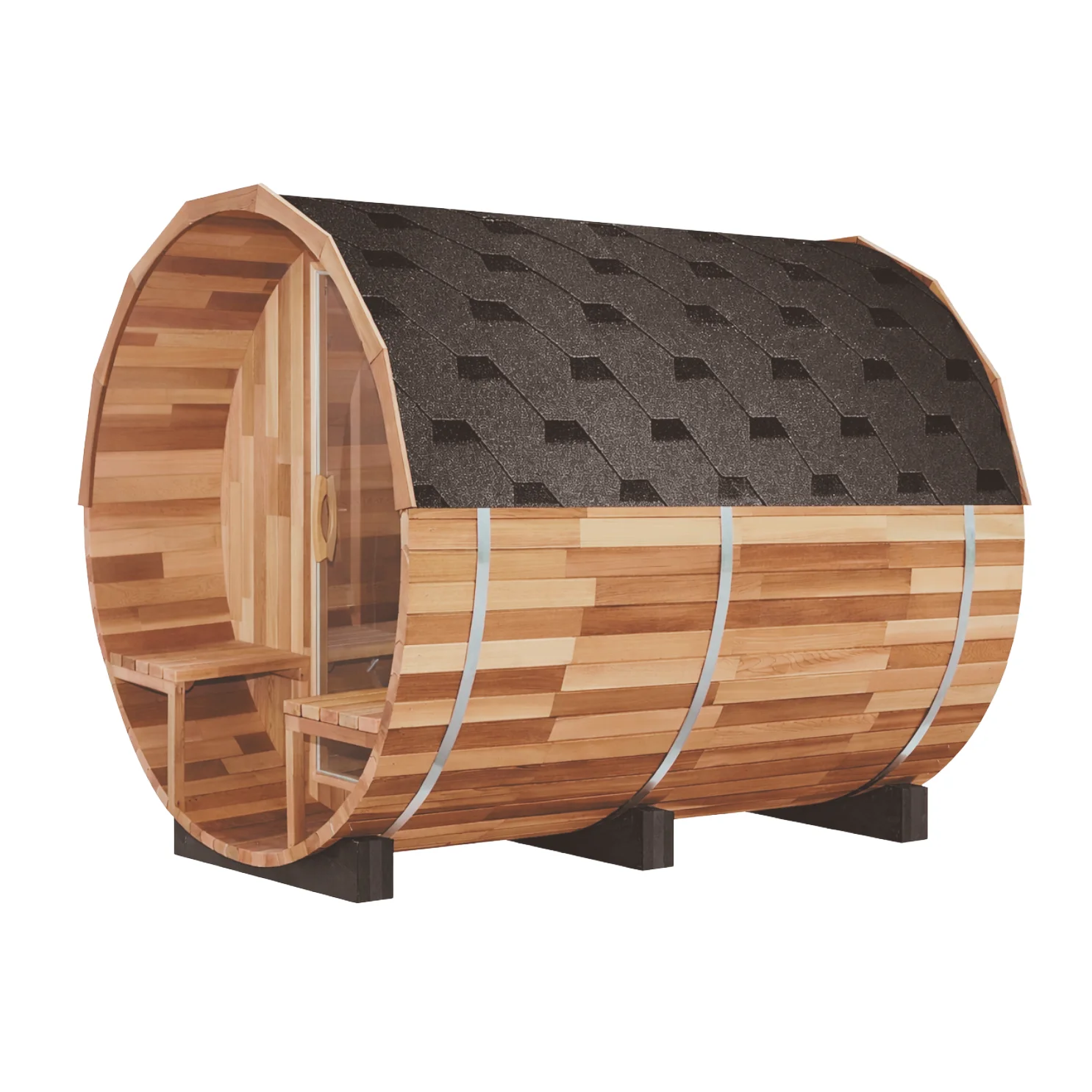The barrel sauna is supported by strong and durable cradles. These cradles are made from materials like carbon fiber or timber, which make them weather-resistant and prevent moisture damage. They are also designed to keep the sauna stable, insulated, and well-ventilated.