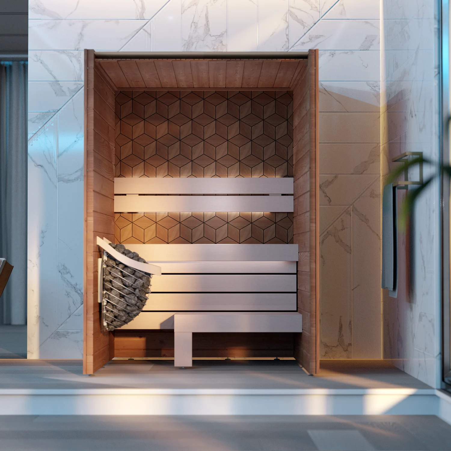 The interior is fitted with smooth aspen benches and backrests, known for their heat resistance and comfortable seating surface.