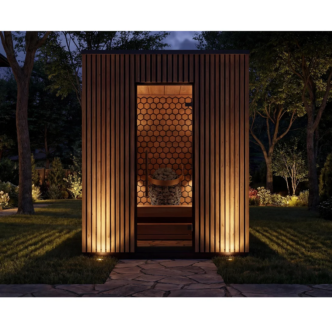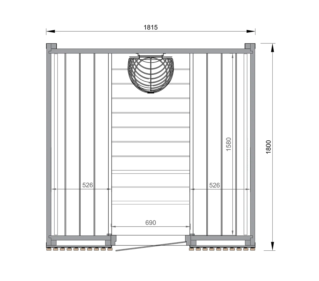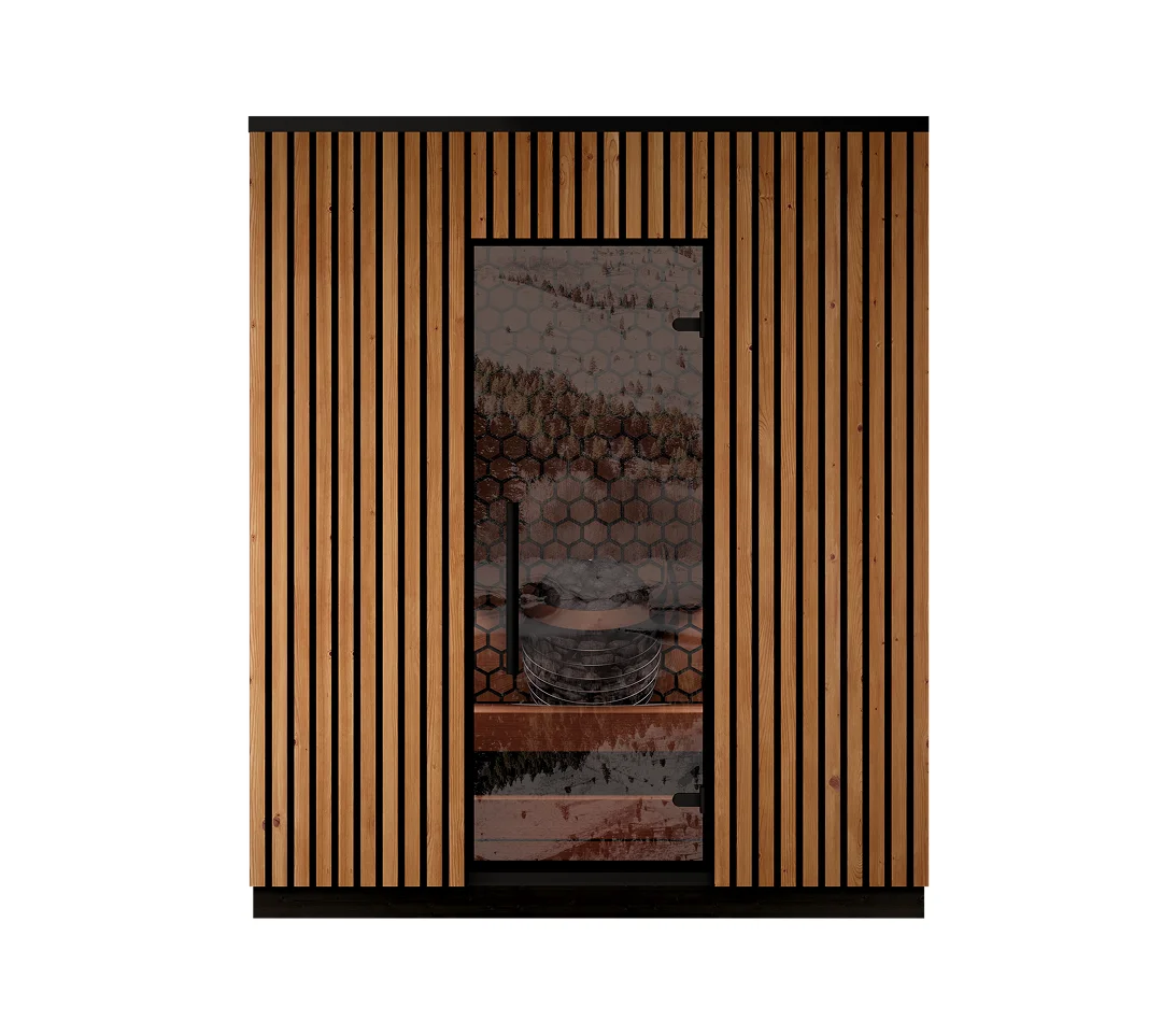 The Leil® VIVA 180 Outdoor Sauna (4 Person) – MADE IN EUROPE features a spacious face-to-face bench layout designed for conversation and balanced leil steam. The heater is integrated into the back wall for a safe, space-efficient configuration.