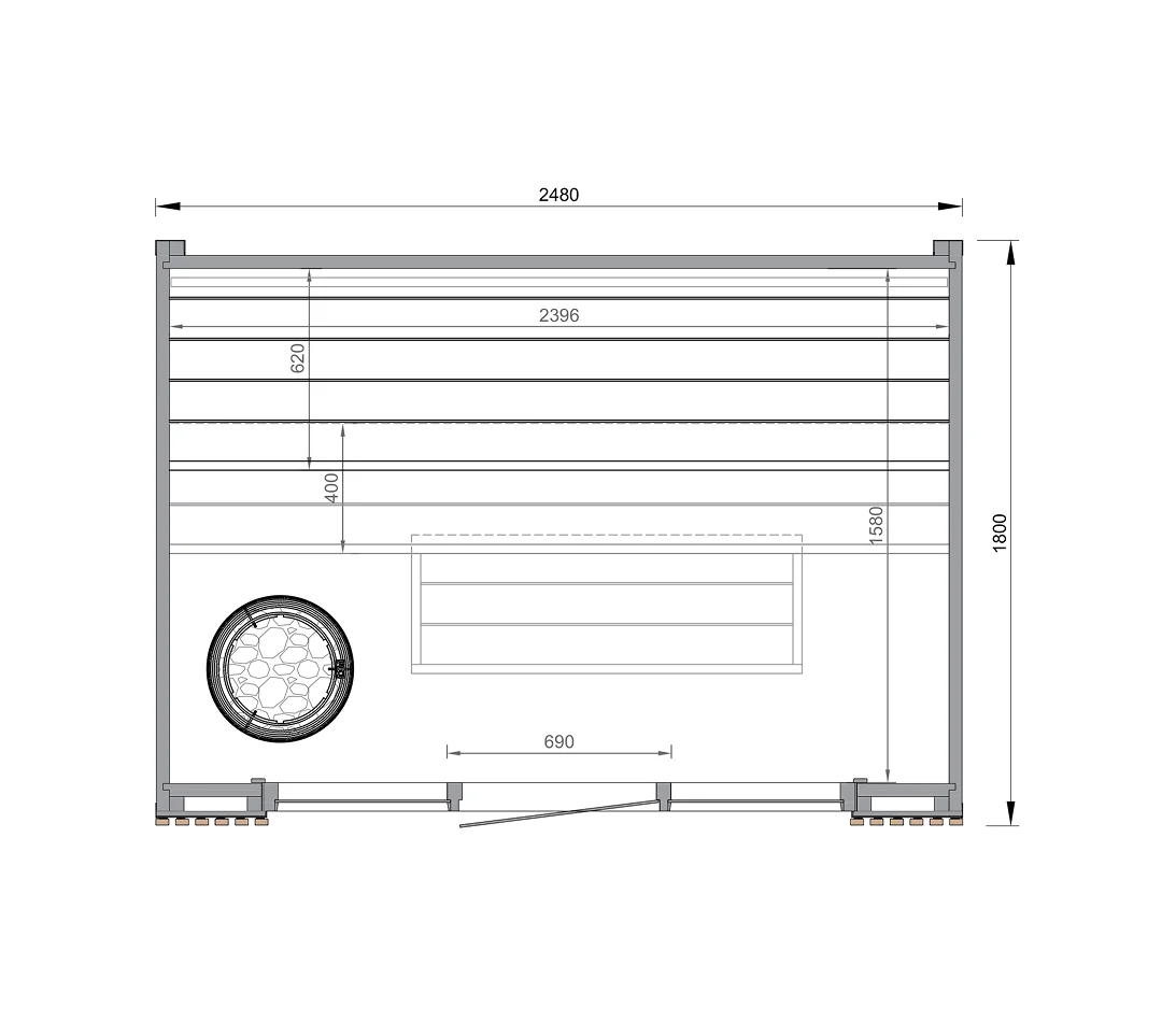 Equipped with thermo alder benches and backrests, chosen for heat resistance and comfort.