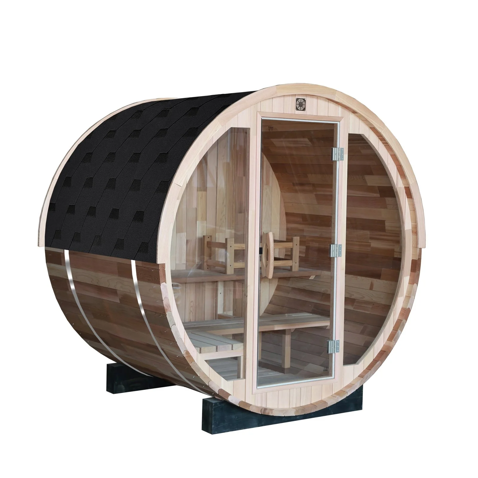 This stylish and spacious sauna is 200 cm in diameter and 160 cm long, yet still comfortably accommodates up to 3-5 people. Plus, the total package weighs only 350-450 kg for easy transportability, and its glass panes at the front ensure that you get to fully enjoy the breathtaking views outside.