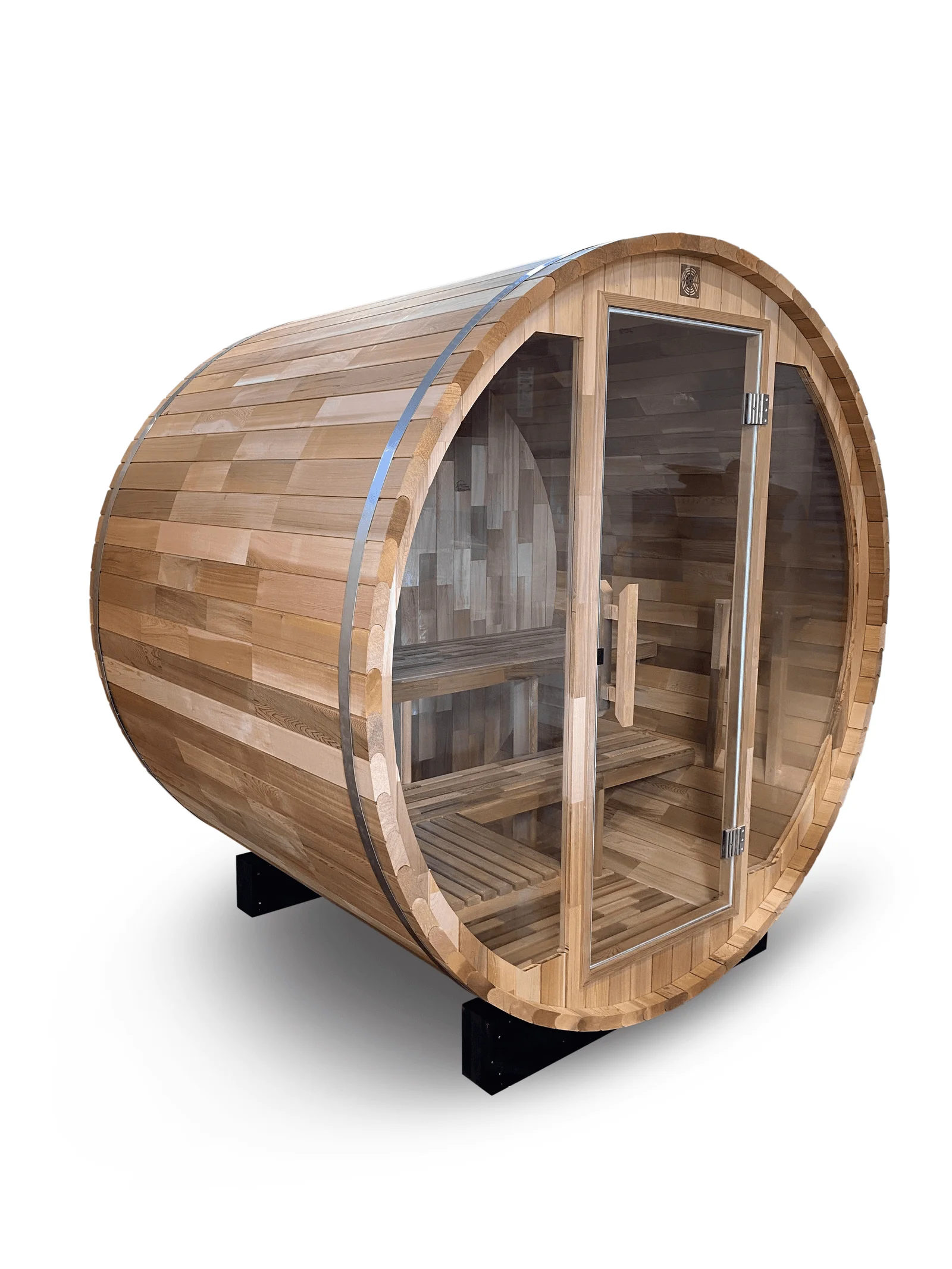 This compact barrel sauna won’t feel small as it offers a full glass front for both the doors and windowpanes. This allows you to enjoy unobstructed views of your surroundings, giving an open and airy atmosphere to the sauna experience.