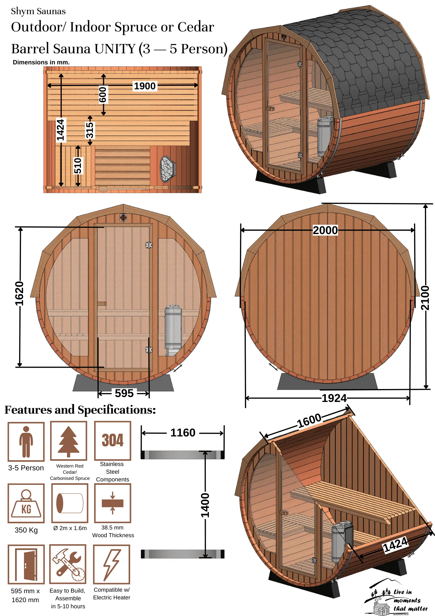 UNITY (3 – 5 Person) Outdoor/Indoor Spruce or Cedar Barrel Sauna