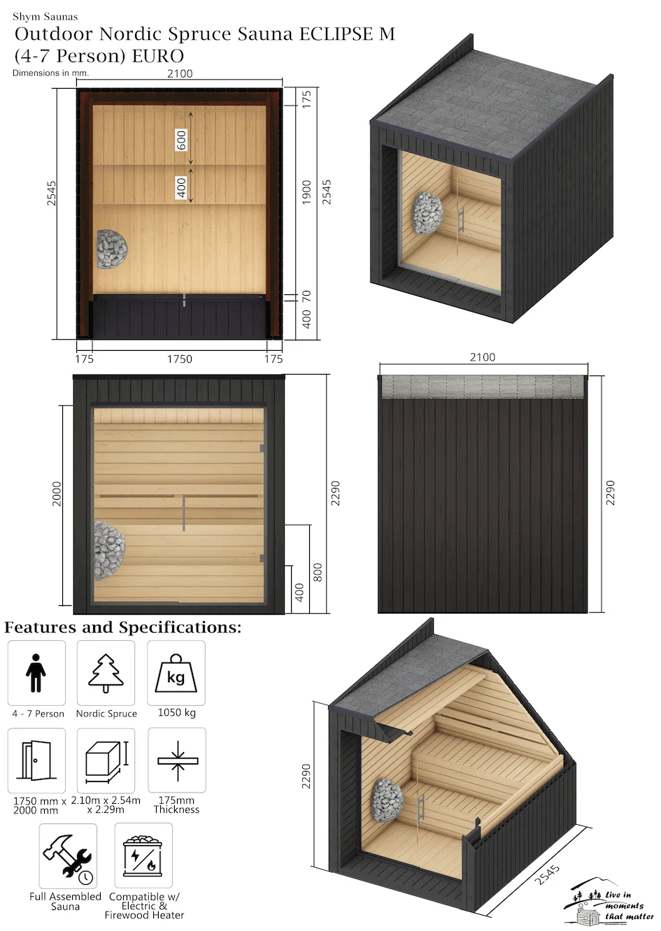 Looking for a sanctuary of relaxation and elegance tailored for 4-7 people? Shym Saunas introduces the Outdoor Nordic Spruce Sauna ECLIPSE M EURO—a sleek, modern design that elevates any outdoor space, making it the perfect addition to your home spa. Expertly crafted with premium materials, this sauna offers an unparalleled experience that blends beauty, simplicity, and functionality.