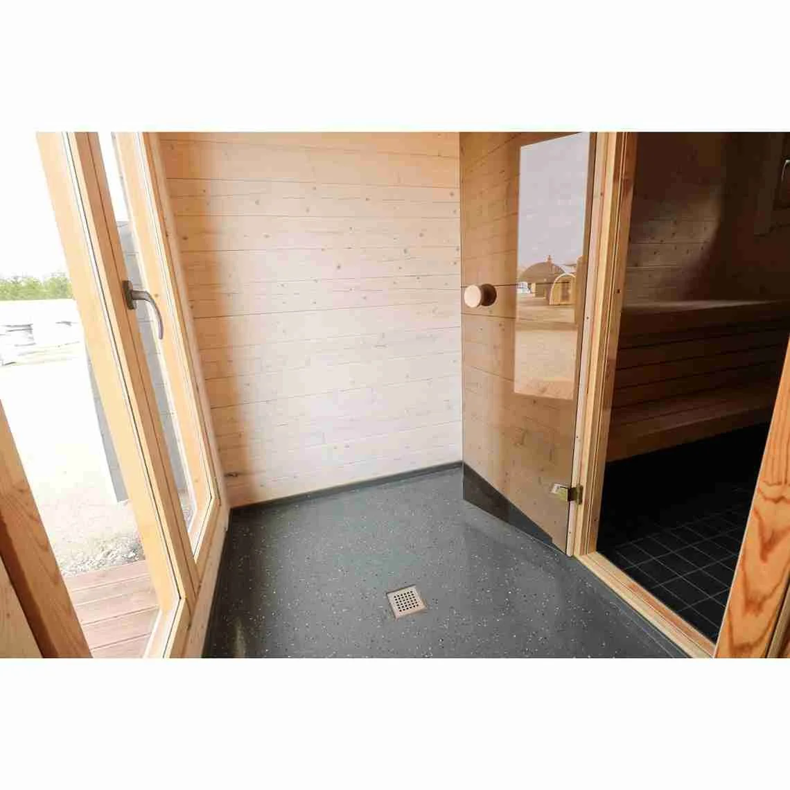 A metal floor gutter in the sauna room prevents water accumulation, ensuring a clean, low-maintenance experience after every session.