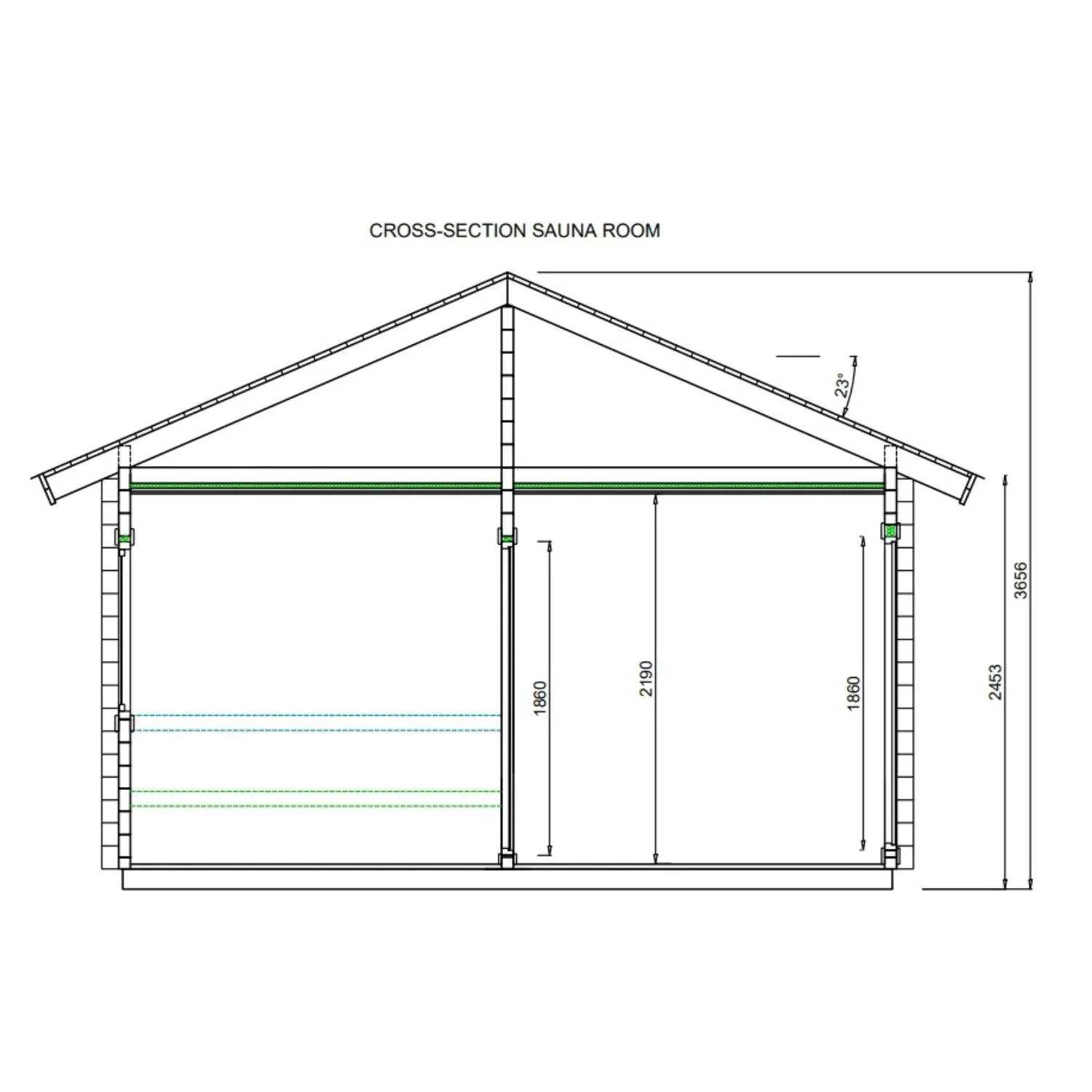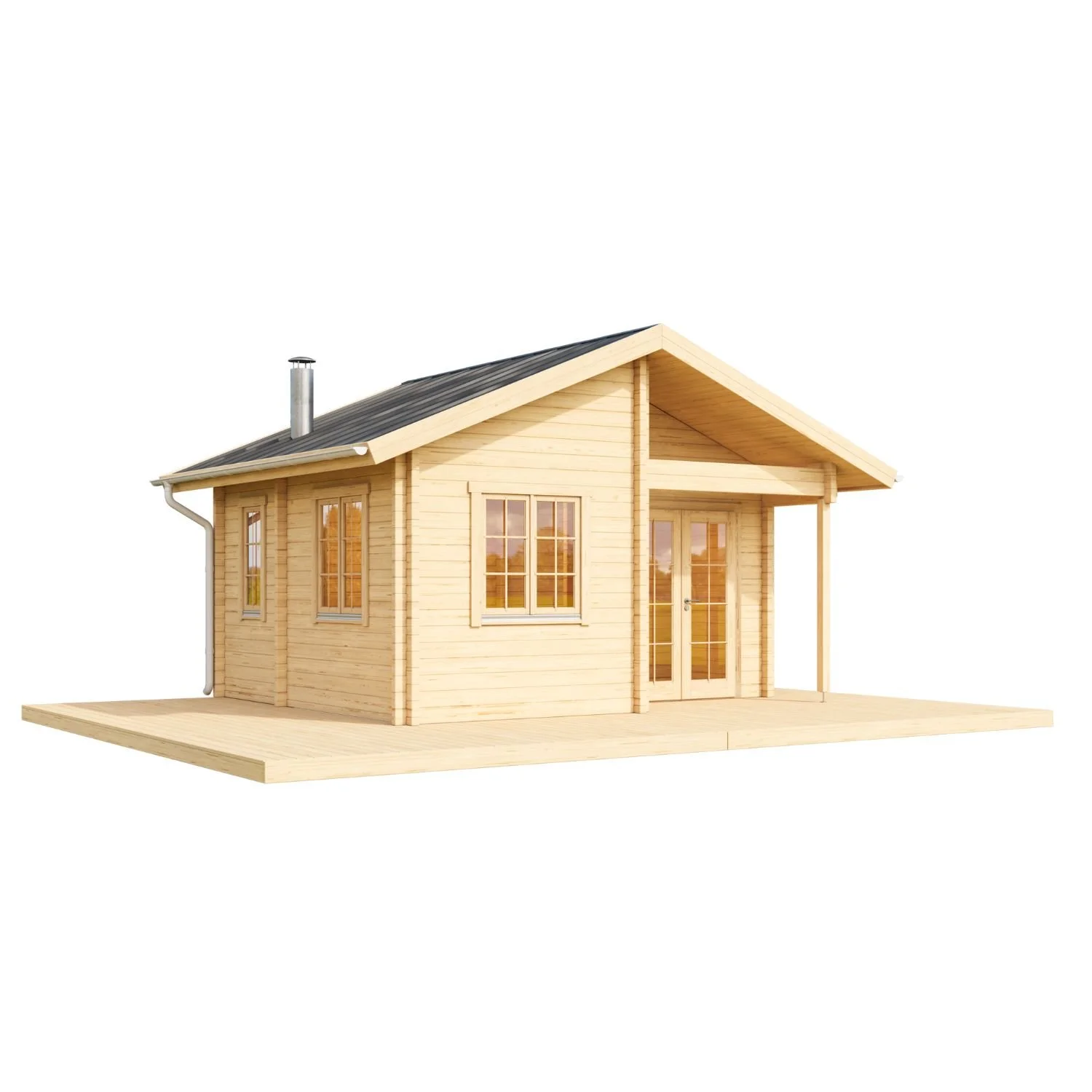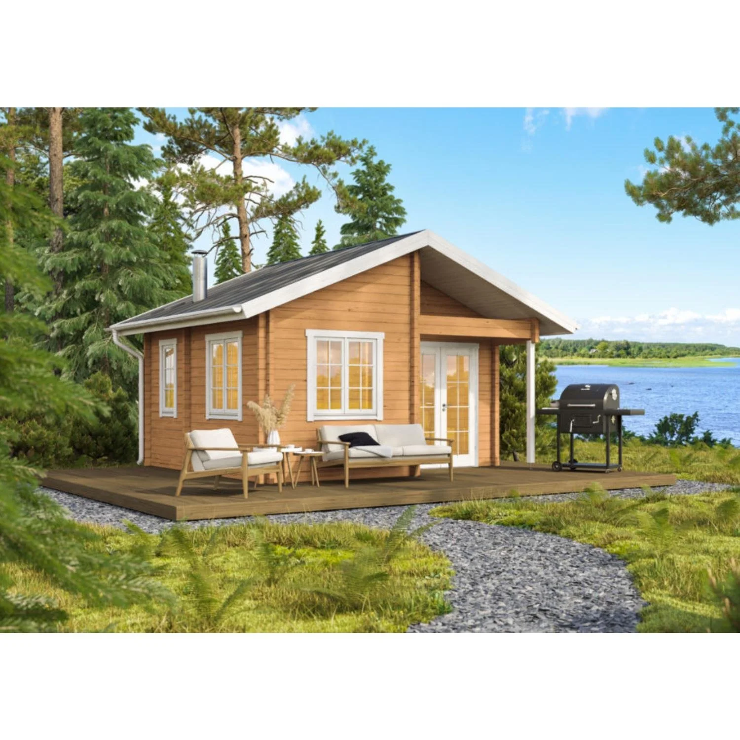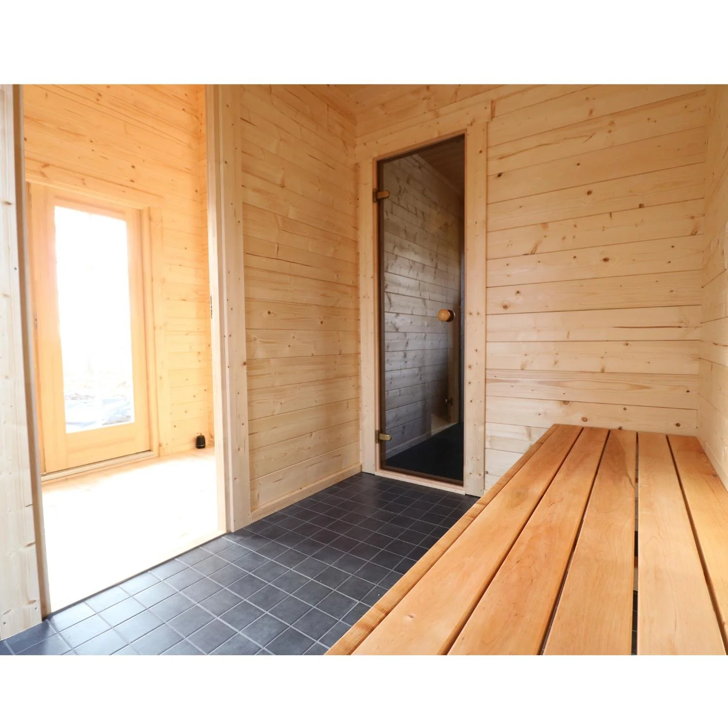 The Boden Sauna/Summer House masterfully blends quality and comfort, featuring 70mm laminated spruce walls and an insulated sauna room. This cabin boasts three functional rooms and a spacious terrace, complete with alder sauna benches, tempered double-glass windows, and a lockable wooden door for added privacy. An overhang roof with impregnated decking offers the perfect outdoor spot to cool off and relax. Designed for lasting durability and timeless appeal, the Boden Sauna House is your ideal retreat for wellness and leisure.