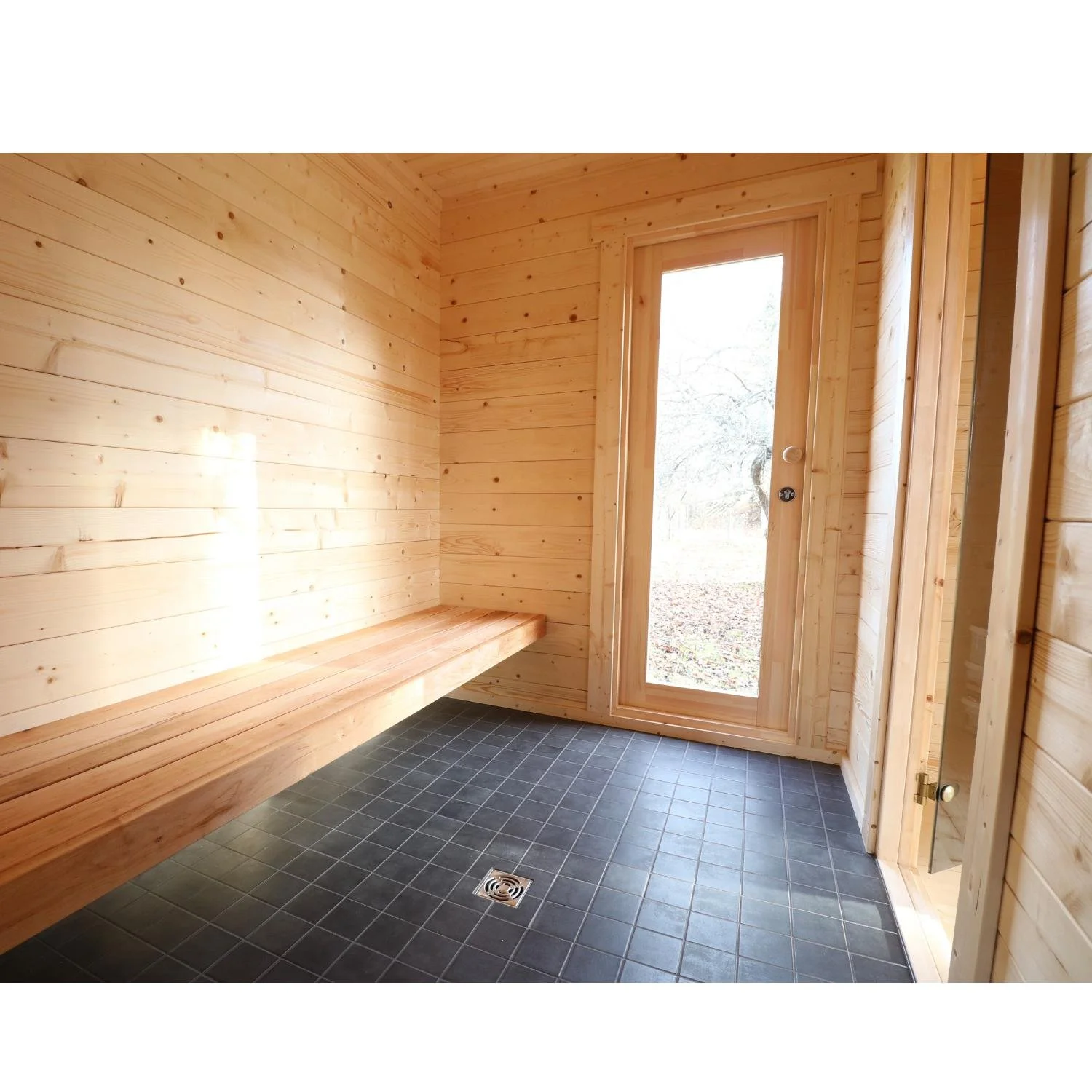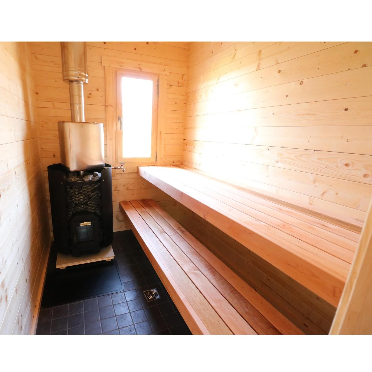 The sauna and washroom roofs feature 30mm SPU (Styrofoam Polyurethane) insulation, ensuring excellent thermal performance. This insulation maintains a consistent temperature, reduces heat loss, and enhances energy efficiency for a more enjoyable sauna experience.